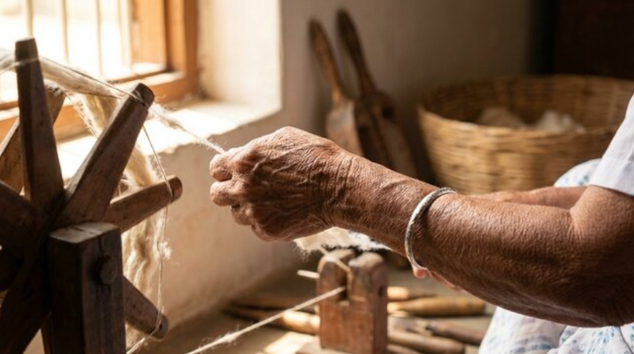 Hand-spun using the Amber Charkha. This slow, rhythmic cadence preserves high-tensile strength.